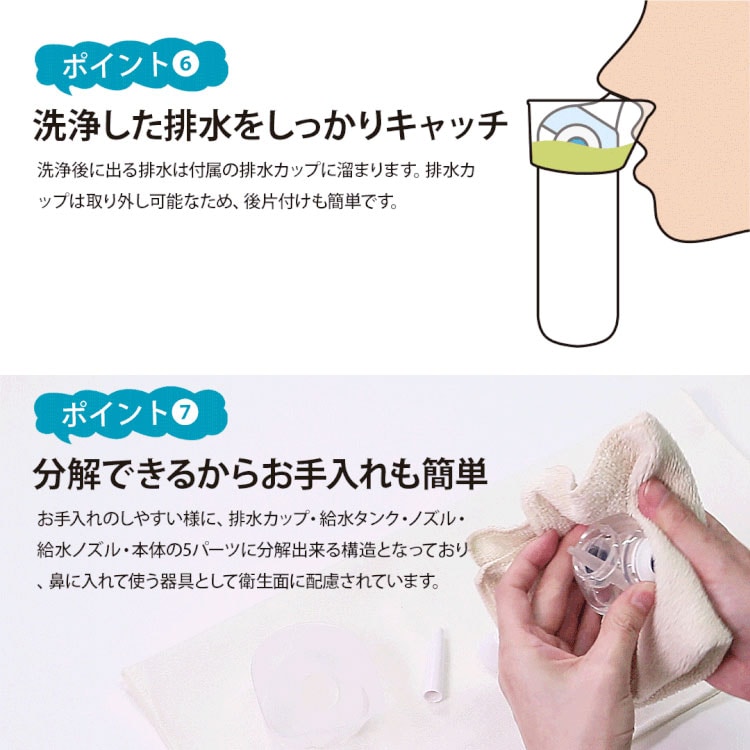 | 備考 | 以下の人は使用しないでください。 ・内耳と耳膜手術、口腔咽頭部損傷または外科手術を受けた時 ・中耳炎にかかっている ・風邪を引くなどして鼻が詰まっている、また鼻を充分にかめない場合 ・鼻や耳に出血・外傷・外耳炎等の疾患がある、または鼻の粘膜が弱い方 ・礫下障害がある ・塩化ナトリウム代謝障害がある場合 ・自分で意思表示ができない人や、自分で操作できない人だけで使用させない ・乳幼児や7歳未満の子供には使用させない 子供(7歳以上)が使用する場合は必ず大人が付き添い、目を離さない ・子供の手が届くところに置かない ・鼻腔内の洗浄以外の目的に使用しない ・耳鼻科および眼科の疾患のある方や過去にあった方は、専門の医師に相談の上使用する |