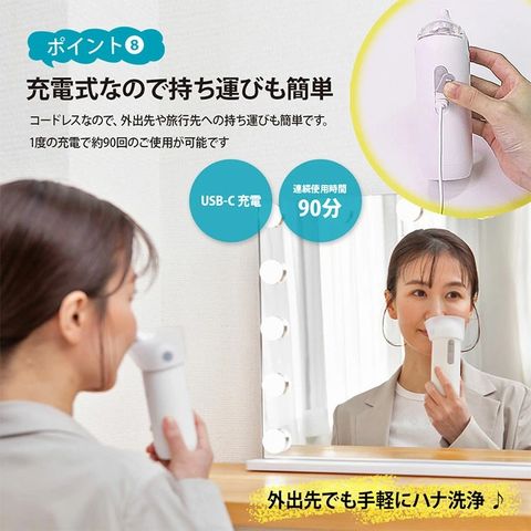 | 仕様 | ■一般的名称:鼻用洗浄器 ■使用電池:リチウムイオン電池 DC3.7V 1100mAh ■切り忘れタイマー:約10分 ■充電時間:約100分 (DC5V/1.5A出力のアダプター使用時) ■連続使用時間:約90分 ■付属品:排水カップ×1、給水タンク×1、USBケーブル (タイプC-タイプA) ■推奨アダプター出力:DC5V/1.5A~2.5A以下出力の物※急速充電器は非対応 ■防水等級(本体):IPX5 ■製品保証:1年 |