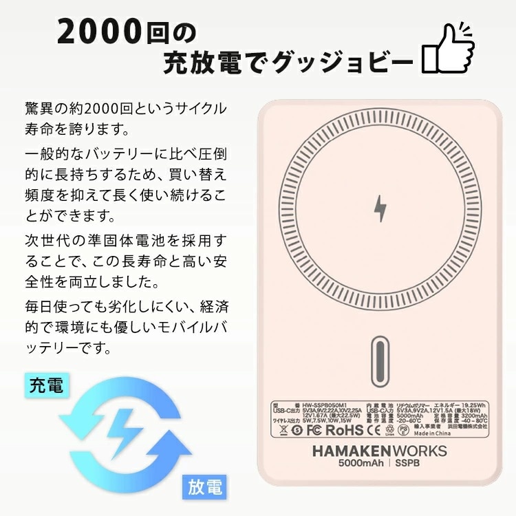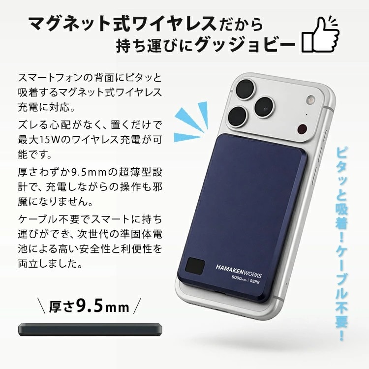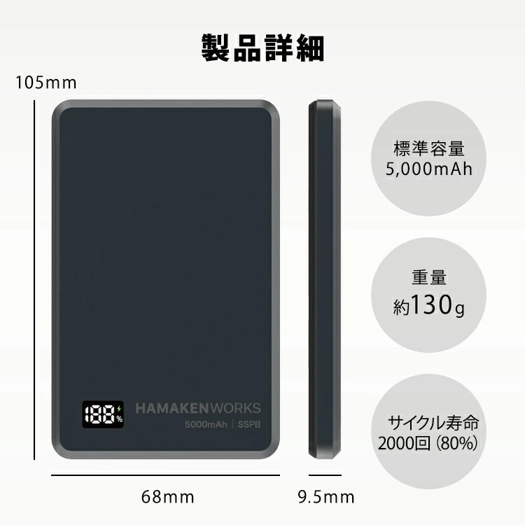 ■keyword:モバイルバッテリー/準固体電池/次世代/安全/燃えない/マグネット式/ワイヤレス充電/MagSafe対応/5000mAh/軽量/薄型/小型/コンパクト/iPhone充電器/Android/急速充電/PD対応/22.5W/高出力/アルミ/高級感/デジタル残量表示/見える化/超寿命/長持ち/2000回サイクル/耐熱/耐寒/アウトドア/キャンプ/災害用/防災/停電対策/HAMAKENWORKS/JOVY/SSPB/最新家電/ガジェット/スマホアクセサリ/持ち運び/機内持ち込み/出張/旅行/プレゼント/おしゃれ/ミニマリスト/強力マグネット/ワイヤレスチャージャー/タイプC/USB-C/大容量/予備電源/PSE認証/高密度/熱くならない/磁石/貼り付く/コードレス/置くだけ充電/プレゼント/プチギフト/贈り物/贈答品/お祝い/誕プレ/誕生日プレゼント/バースデー/クリスマスプレゼント/バレンタインデー/ホワイトデー/返礼品/お返し/サプライズ/記念日/友人/友達/友だち/新生活/大学生/社会人/母の日/父の日/敬老の日/10代/20代/30代/40代/50代/60代/70代/女性/男性/