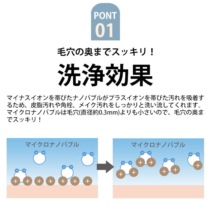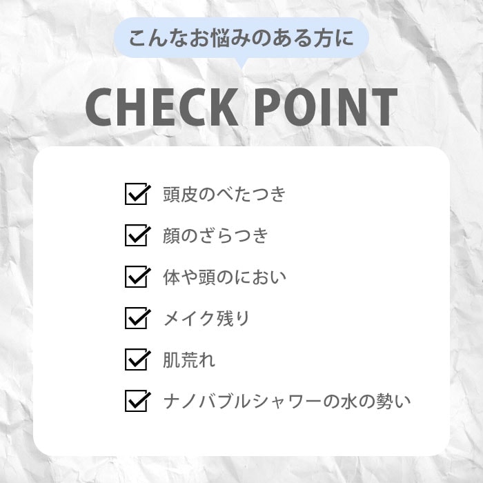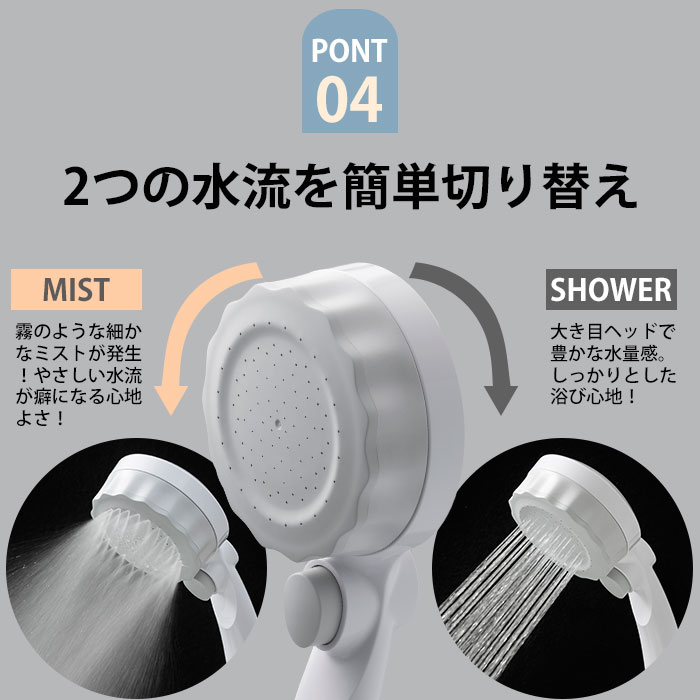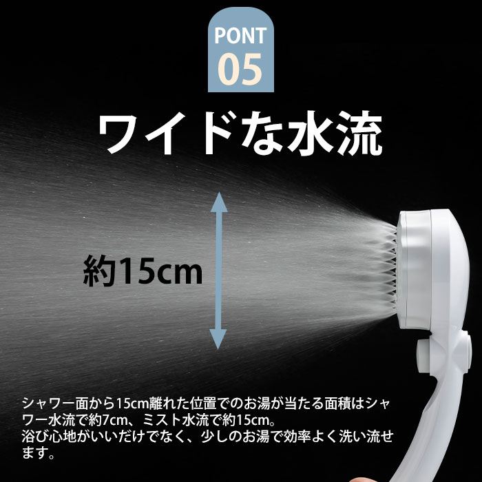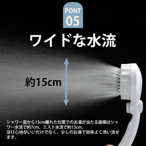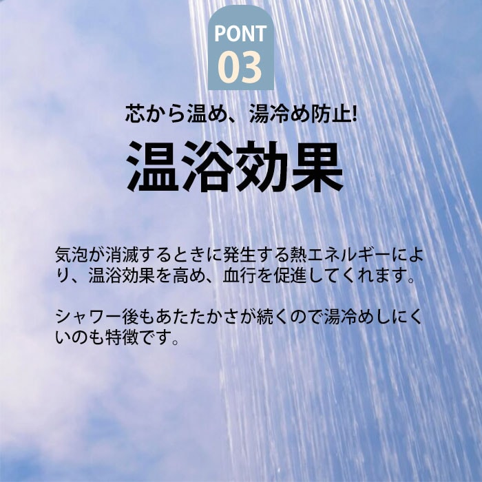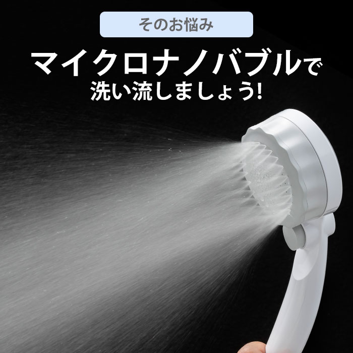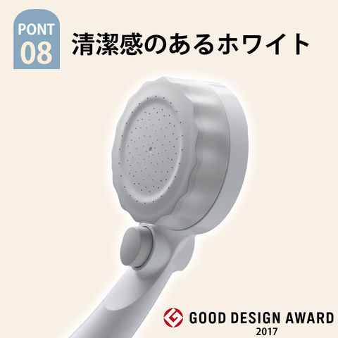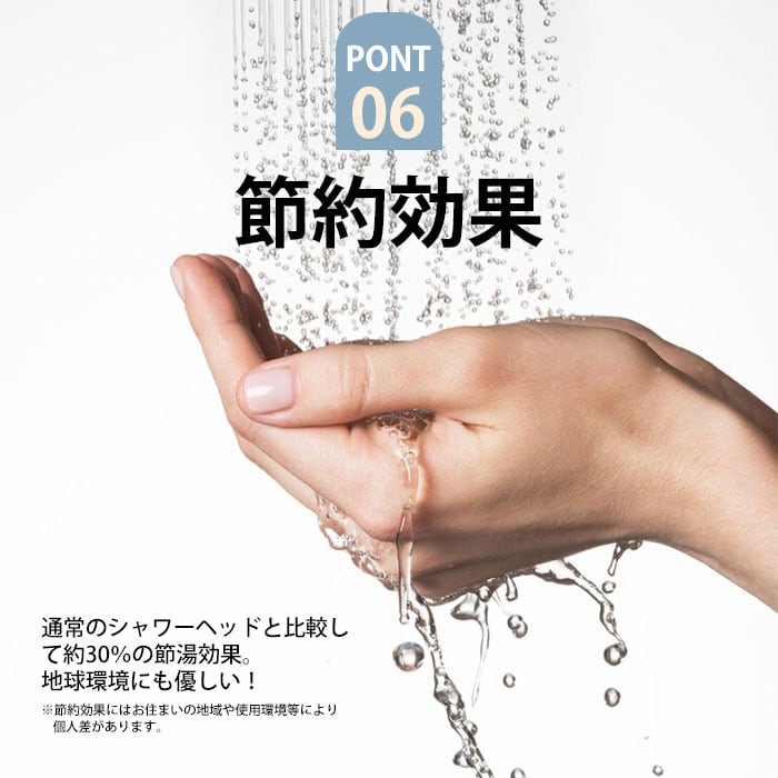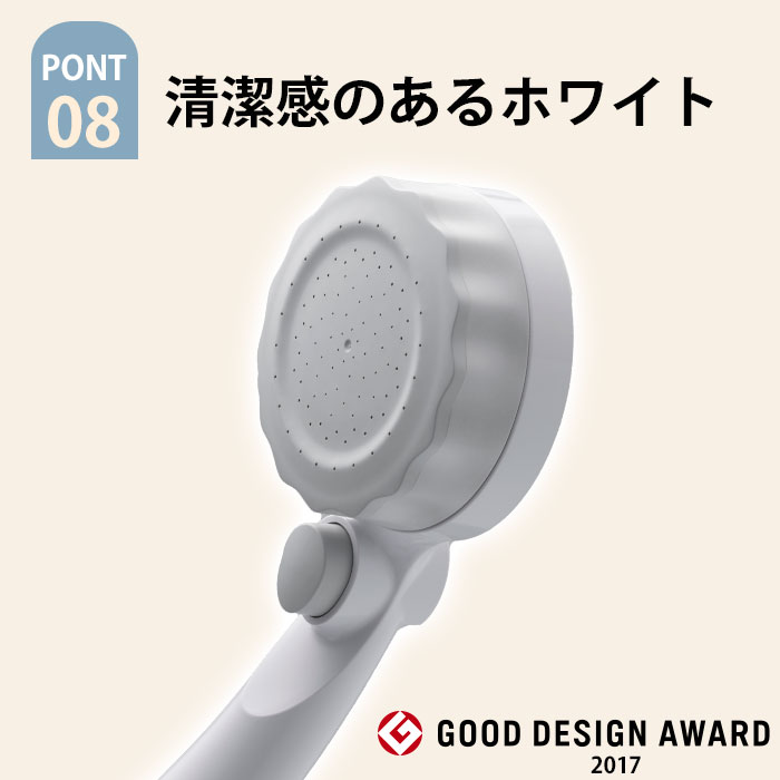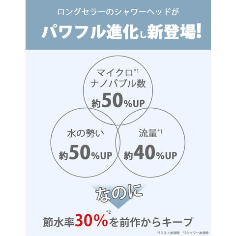 point1:洗浄効果 ファンデーションを使用した実証実験でも、通常のシャワーヘッドと比較して、ナノバブルシャワーヘッドの方がしわの奥まで汚れが落ちていることが分かります。 不要なものを落とすことが、肌のゴワつきの改善やターンオーバーを整える事につながり、美しい肌や健やかな頭皮環境を作る第一歩となります。 point2:保湿効果 マイクロナノバブルが肌の奥まで浸透し、肌の潤いを保ってくれます。 実証実験の結果、30分後の肌水分増加率が通常のシャワーと比べて約60%もアップ! ※メーカー調べ point3:温浴効果 気泡が消滅するときに発生する熱エネルギーにより、温浴効果を高め、血行を促進してくれます。 シャワー後もあたたかさが続くので湯冷めしにくいのも特徴です。 point4:2つの水流を簡単切り替え 通常のシャワー水流の他、霧状の細かなミスト水流への切替が可能です。マイクロナノバブルをたっぷり含んだミスト水流はクセになる水流で、お客様からも「心地良い!」とのお声を多数いただいている口コミでも評判の水流です。 point5:ワイドな水流 ヘッドの部分を大き目にすることで、水量をたっぷり感じられる、より気持ちの良いワイドな水流を実現しました。他社製品と比較しても、ぜいたくで浴び心地の良い水流になっています。 point6:節約効果 通常のシャワーヘッドと比較して約30%の節湯効果。 地球環境にも優しい! ※節約効果にはお住まいの地域や使用環境等により個人差があります。 point7:一時ストップボタン付き 手元のボタンで簡単にお湯を止められる一時ストップボタン付きタイプです。お湯の無駄遣いを防ぐことが出来ます。 point8:清潔感のあるホワイト グッドデザイン賞2017を受賞した外観はそのままに。人間工学に基づいたデザインです。清潔感のあるホワイトで、どんな浴室にも合わせやすいカラーです。 |