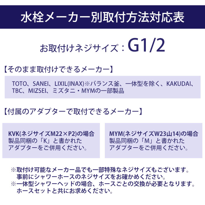 | 仕様 | 付属品:シャワーヘッド用アダプター2種 取付ネジ径:G1/2(KVKはK、MYM(太ホース)はMのアダプターをご併用下さい) 使用可能水圧:0.1MPa?0.3MPa ※水圧が0.3MPa以上の場合、調圧弁を使用してください。 |