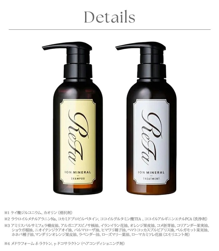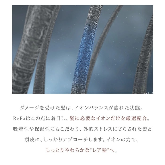サロン帰りのような仕上がりをご自宅で。ReFaならではの2ステップで、ときめく“レア髪”へ。 ※1 ケイ酸ジルコニウム、カオリン(滑沢剤) ※2 ラウロイルメチルアラニンNa、コカミドプロピルベタイン、ココイルグルタミン酸TEA 、ココイルアルギニンエチルPCA(洗浄剤) ※3 アミリスバルサミフェラ樹皮油、アルガニアスピノサ核油、イランイラン花油、オレンジ果皮油、コメ胚芽油、コリアンダー果実油、ショウガ根油、ニオイテンジクアオイ油、パルマローザ油、ヒマワリ種子油、ヘマトコッカスプルビアリス油、ベルガモット果実油、ホホバ種子油、マンダリンオレンジ果皮油、ラベンダー油、ローズマリー葉油、ローマカミツレ花油(エモリエント剤) ※4 メドウフォーム-δ-ラクトン、γ-ドコサラクトン(ヘアコンディショニング剤) |
