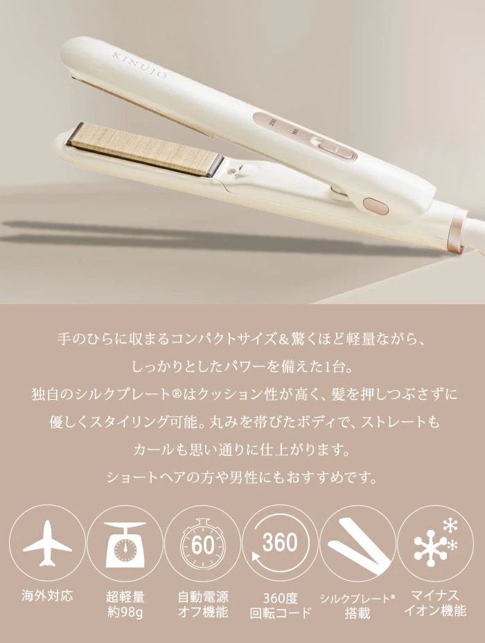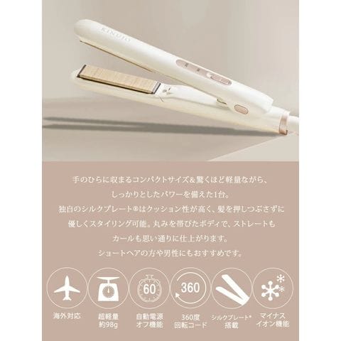 「KINUJO MINI IRON -deux-」は、手のひらサイズのコンパクト設計と約98gの軽さで、持ち運びにも便利なミニヘアアイロンです。