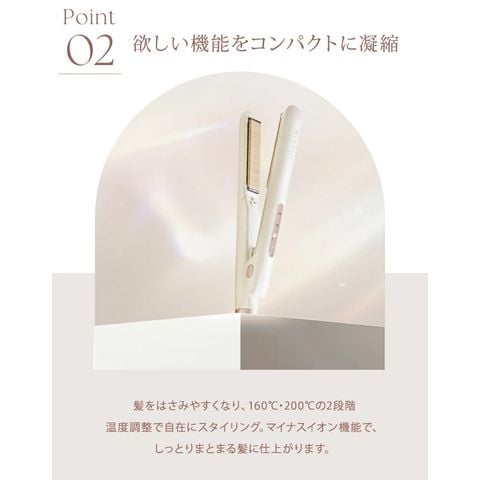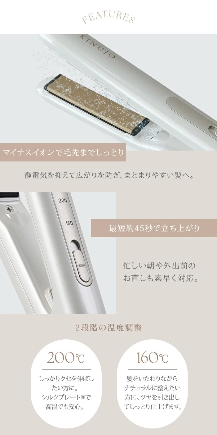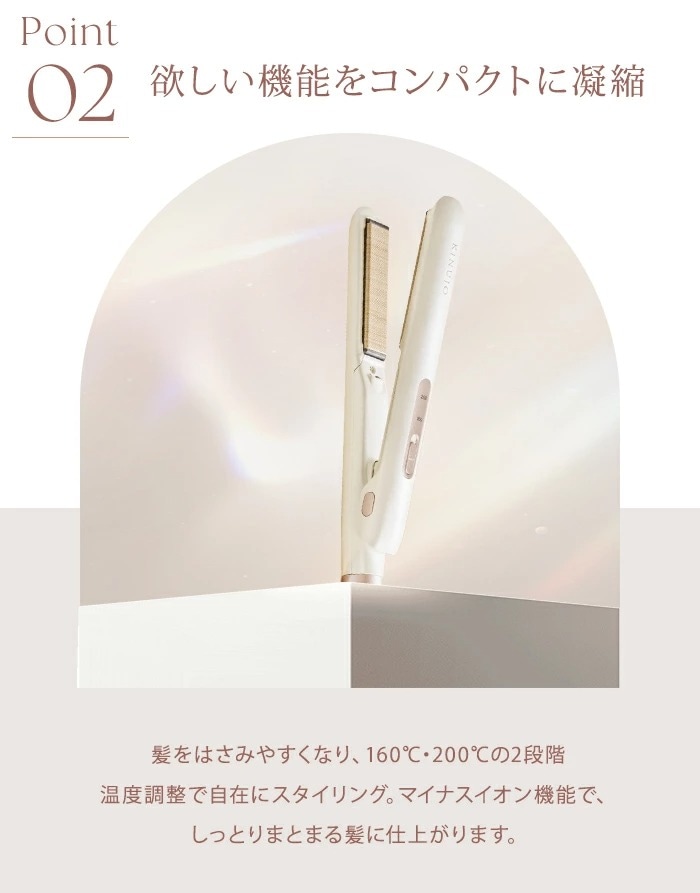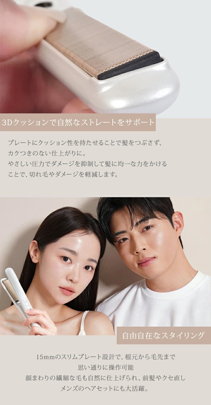 前髪や顔まわり、毛先のニュアンス作りはもちろん、ショートヘアやメンズにもおすすめ。160℃と200℃の2段階温度調整で、髪質やシーンに合わせた自在なスタイリングが可能です。