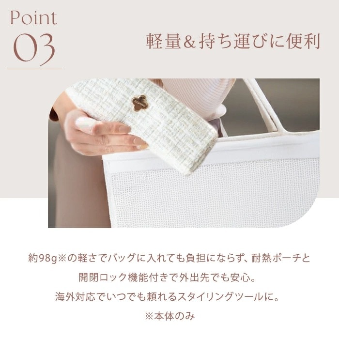 海外対応(100V~240V)だから、旅行や出張にも最適。耐熱ポーチと開閉ロック機能付きで、持ち運びも安心。どこにいても、あなたらしい美しさを叶えます。
