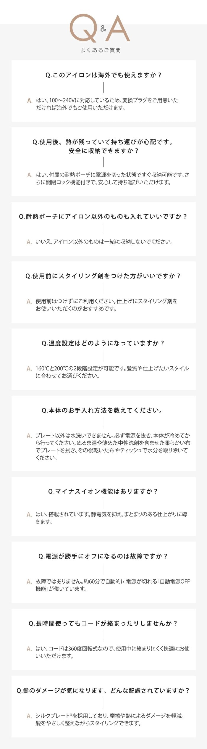 独自のシルクプレートRを採用し、髪をやさしく包み込みながら熱を伝えることで、摩擦や熱によるダメージを抑え、しっとりまとまりやすい仕上がりへ導きます。さらにマイナスイオン機能を搭載し、広がりやパサつきを防いでツヤ感のある美しい髪へ。