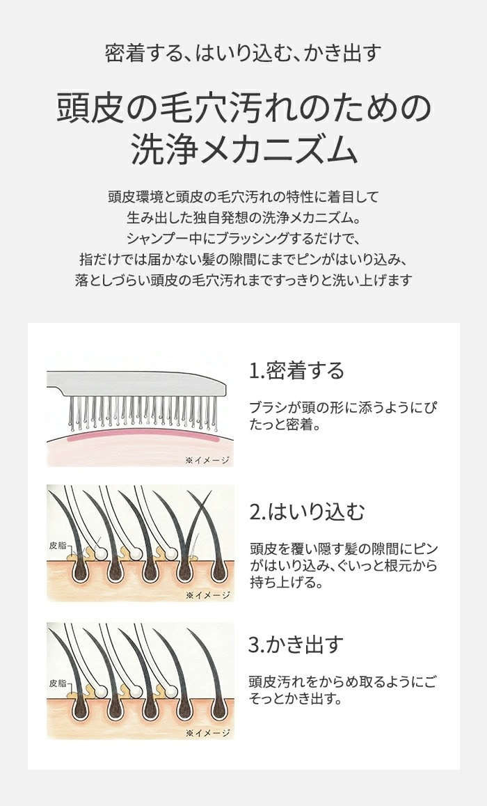 美しい髪のために大切なのは、髪の汚れを落とすだけではなく、 頭皮の毛穴汚れまでしっかりと落とすこと。 毎日のシャンプーに、頭皮の毛穴をブラッシングする習慣を 取り入れてすっきりとすこやかな頭皮へ。 |