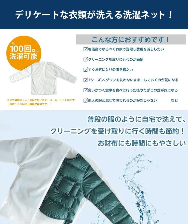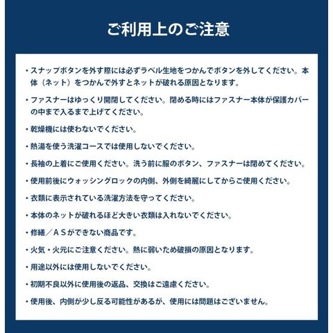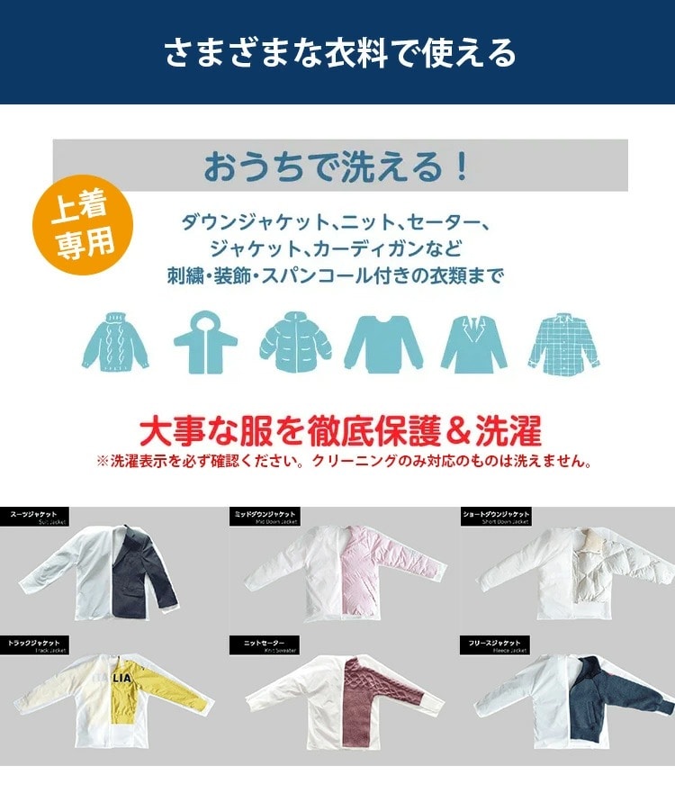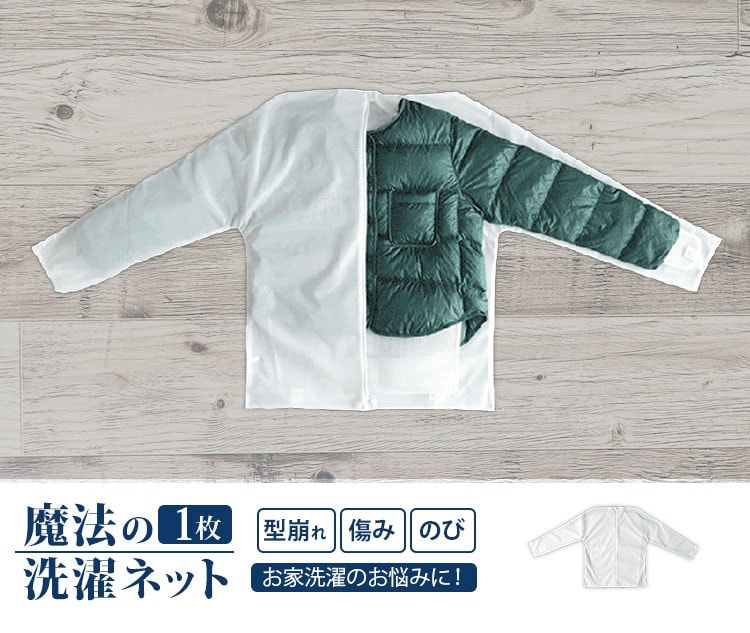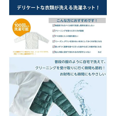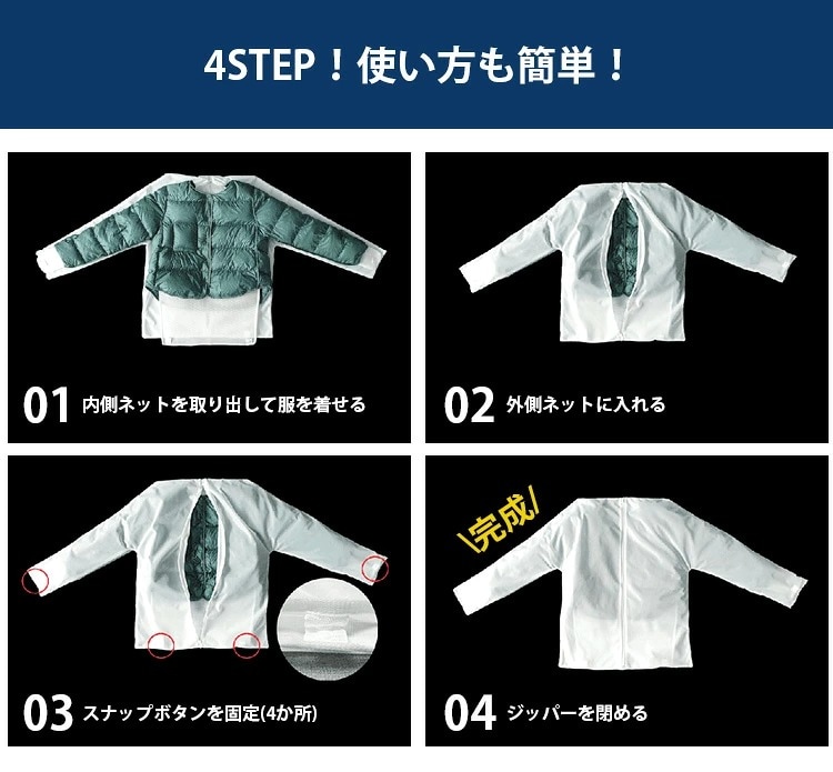 1.内側ネットを取り出して服を着せる 2.外側ネットに入れる 3.スナップボタンを固定(4か所) 4.ジッパーを閉める 自宅で簡単に洗えるからクリーニング費の節約にもなります! |
