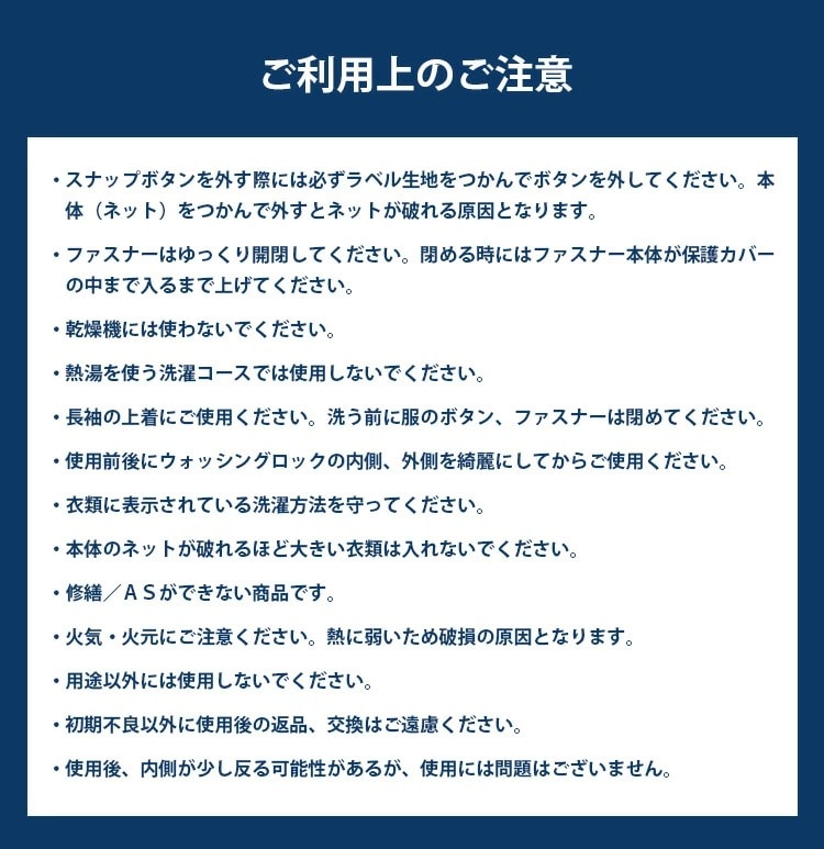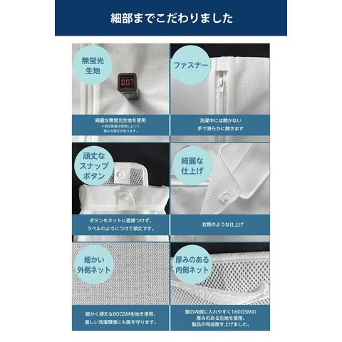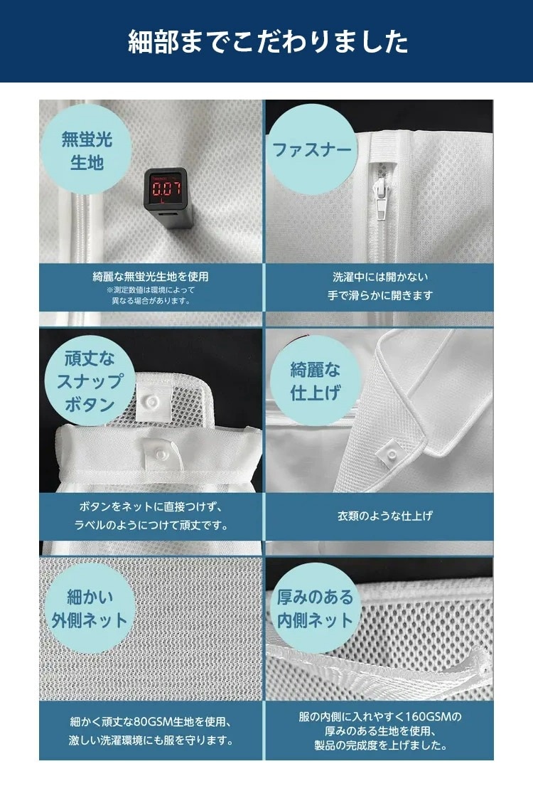 ・無蛍光生地 綺麗な無蛍光生地を使用※測定数値は環境によって異なる場合があります。 ・ファスナー 洗濯中には開かない、手で滑らかに開きます ・スナップボタン ボタンをネットに直接つけず、ラベルのようにつけて頑丈です。 ・綺麗な仕上げ 衣類のような仕上げ ・細かい外側ネット 細かく頑丈な80GSM生地を使用、激しい選択環境にも服を守ります。 ・厚みのある内側ネット 服の内側に入れやすく160GSMの厚みのある生地を使用、製品の完成度を上げました。 |