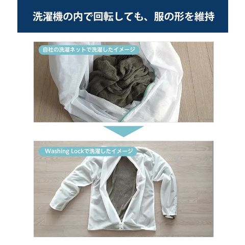 「洗濯網の中でボールのように丸まってしわくちゃになる」 「ダウンジャケットが膨らみあがって空回りする」お悩みからも解放! 「Washing Lock(ウォッシングロック)」が服の形をそのまま維持します。 |