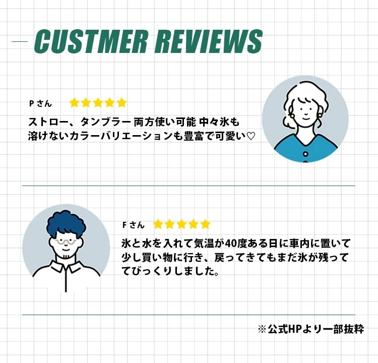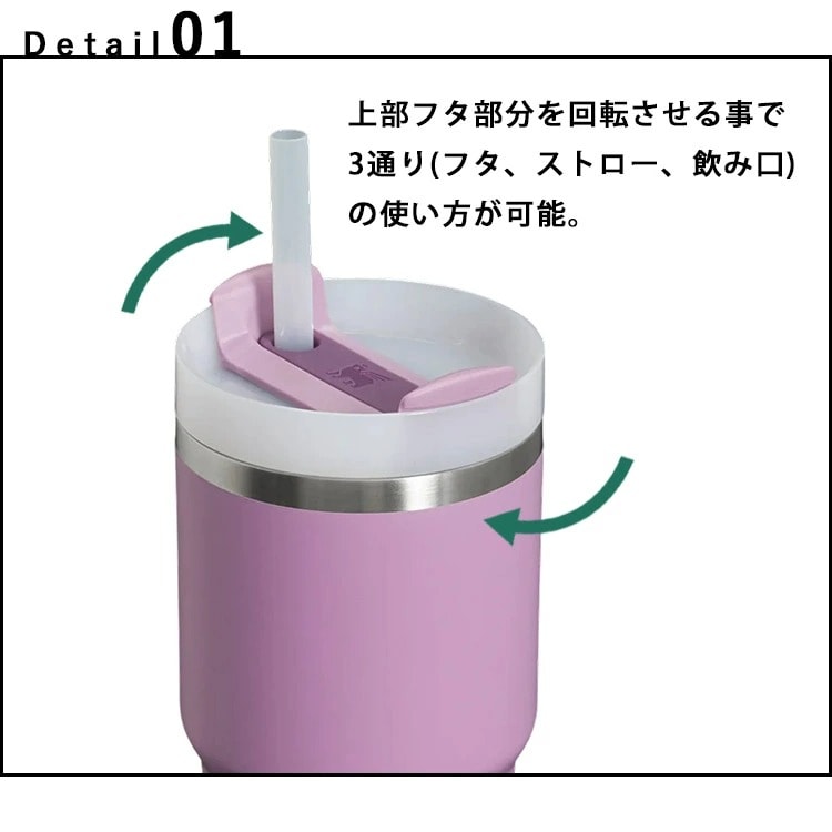■Detail1 上部フタ部分は、回転させることで3通りの使い方が可能に。 ■Detail2 ストローベースにシリコンカバーが付き、ストローは滑りにくく、中身もこぼれにくく改良されました。 ■Detail3 二重壁真空断熱構造 ■Detail4 デスクサイドやベッドサイド、カップホルダー等、どこにでもフィットします。 |