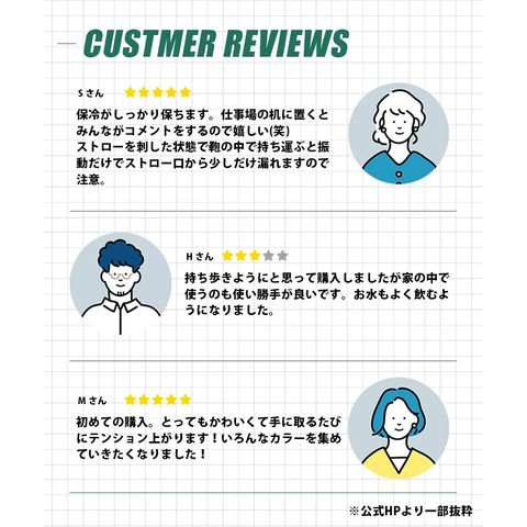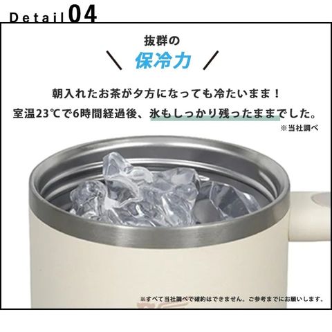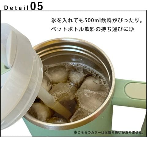 ■Detail1 上部フタ部分は、回転させることで3通りの使い方が可能に。 ■Detail2 ストローベースにシリコンカバーが付き、ストローは滑りにくく、中身もこぼれにくく改良されました。 ■Detail3 人間工学に基づいたハンドルはグリップにより、更に持ちやすくなりました。 ■Detail4 抜群の保冷力 ■Detail5 ペットボトル飲料の持ち運びに◎ |