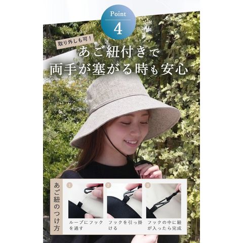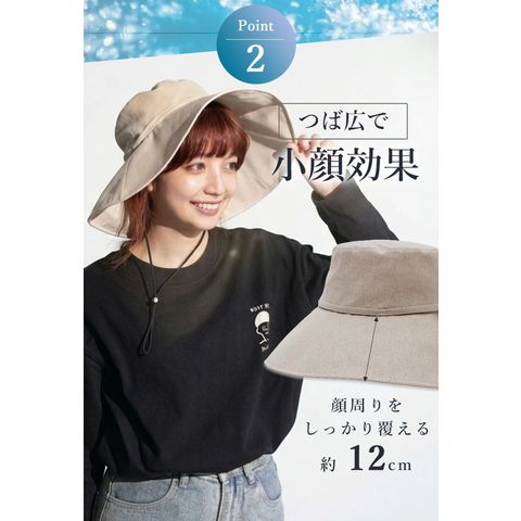 Point.01 紫外線対策×暑さ対策 東レサマーシールドは東レ株式会社とオーロラ株式会社が協業した遮熱・遮光・紫外線遮蔽に優れた素材。 従来にない?4℃以上の高い遮熱効果や、最高レベルと言われる100%の遮光率、そして100%のUVカット率を実現し、肌にも優しく日差し対策を実現できます。 Point.02 つば広で小顔効果 前つば12cm、後ろつば11cmと紫外線や暑さから守りながらも小顔効果も期待できます。 Point.03 テープ調整でお好みのサイズに変更可能 帽子の内側にあるテープで約2.5cmほど調整ができます。 Point.04 取り外しできるあご紐付き 外したいときは、内側のループから紐を外すだけ。 長さ調節もできるので、両手が塞がっていても、日傘代わりに使えます。 Point.05 コンパクトに持ち運び 外出先でも邪魔にならない。 |