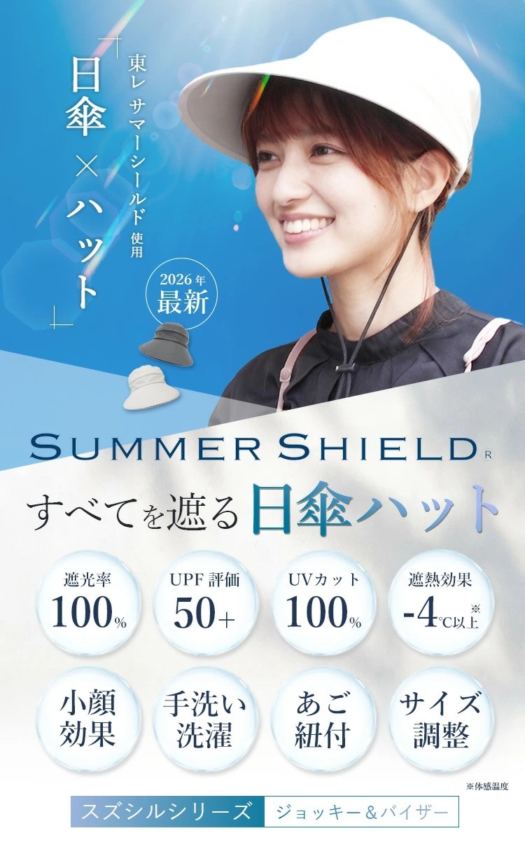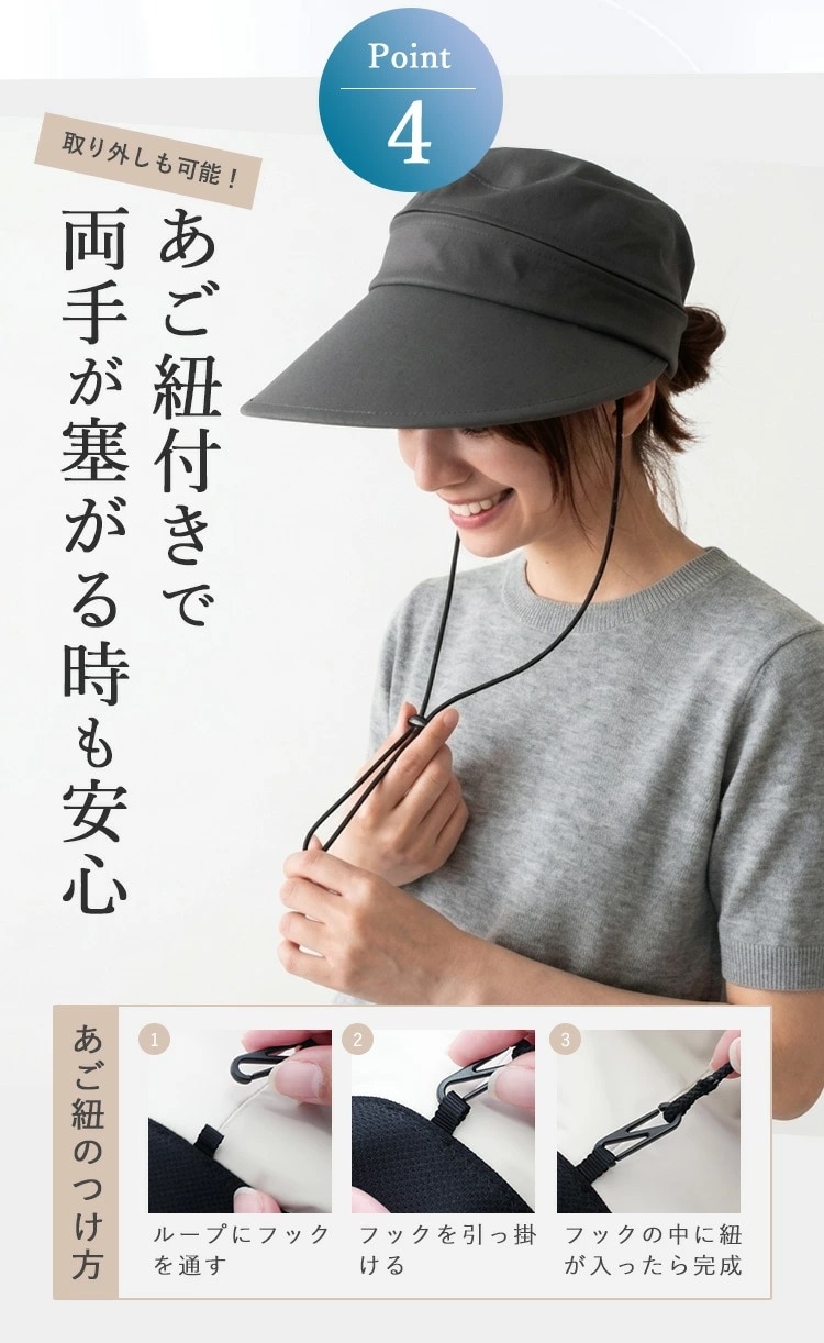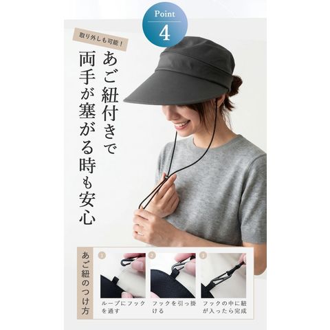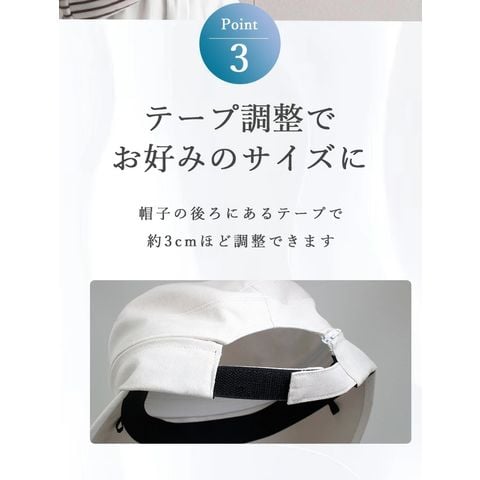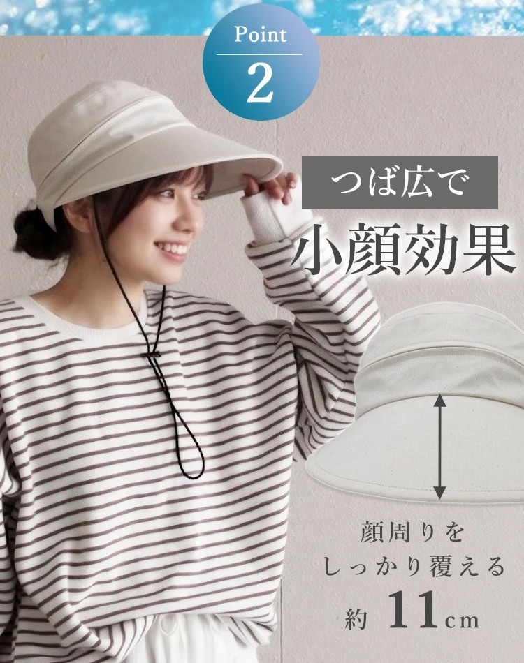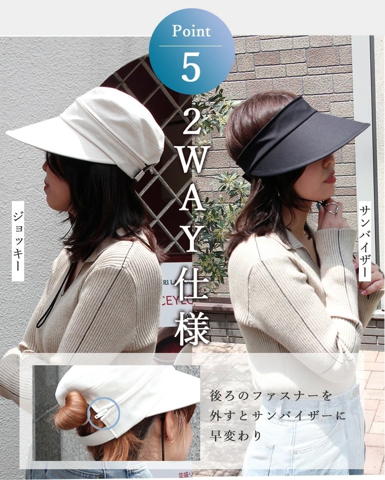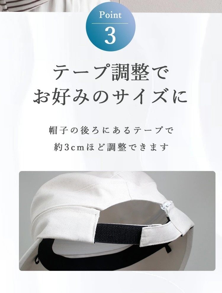 Point.01 紫外線対策×暑さ対策 東レサマーシールドは東レ株式会社とオーロラ株式会社が協業した遮熱・遮光・紫外線遮蔽に優れた素材。 従来にない?4℃以上の高い遮熱効果や、最高レベルと言われる100%の遮光率、そして100%のUVカット率を実現し、肌にも優しく日差し対策を実現できます。 Point.02 つば広で小顔効果 つば11cmと紫外線や暑さから守りながらも小顔効果も期待できます。 Point.03 テープ調整でお好みのサイズに変更可能 帽子の後ろ面にあるテープで約3cmほど調整ができます。 Point.04 取り外しできるあご紐付き 外したいときは、内側のループから紐を外すだけ。 長さ調節もできるので、両手が塞がっていても、日傘代わりに使えます。 Point.05 ジョッキーとサンバイザーの2WAY ファスナーを外すことでジョッキーハットから、サンバイザーへ早変わり!活躍の幅が広がります! |
