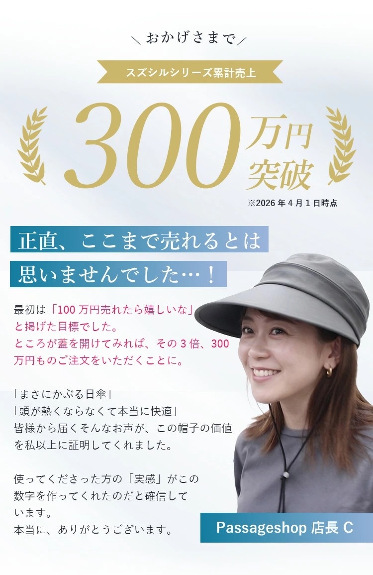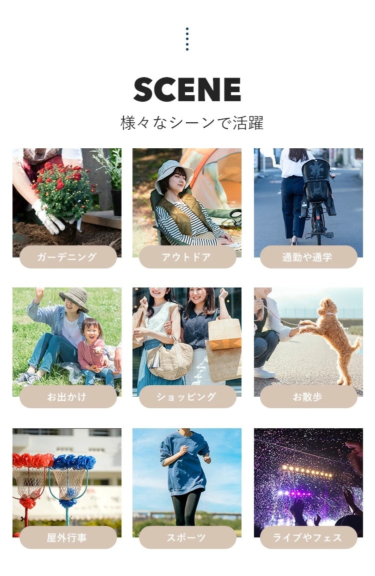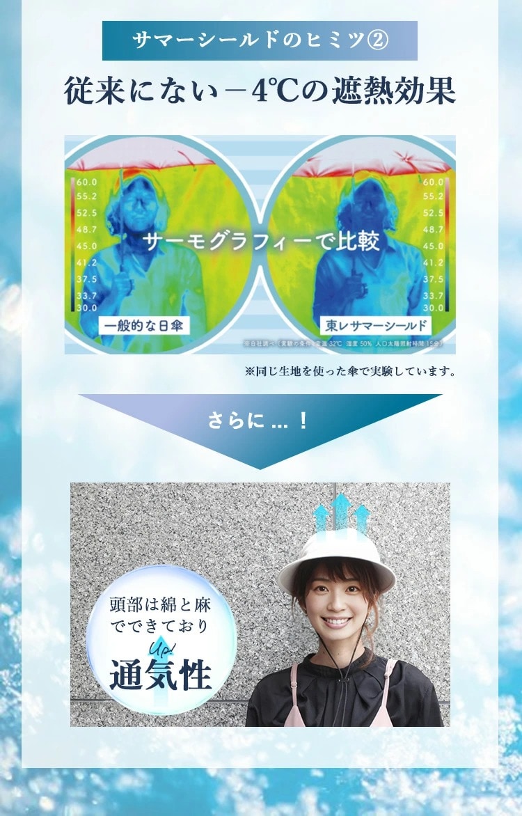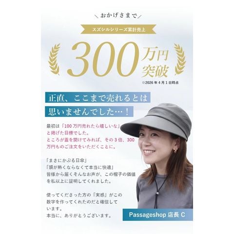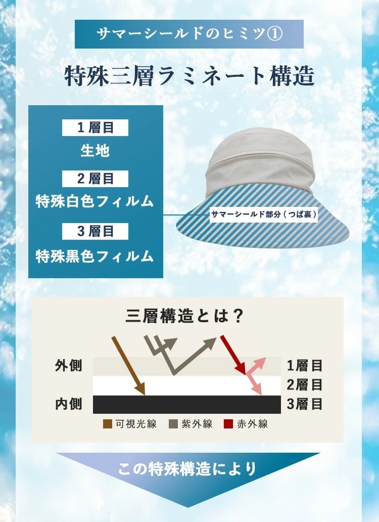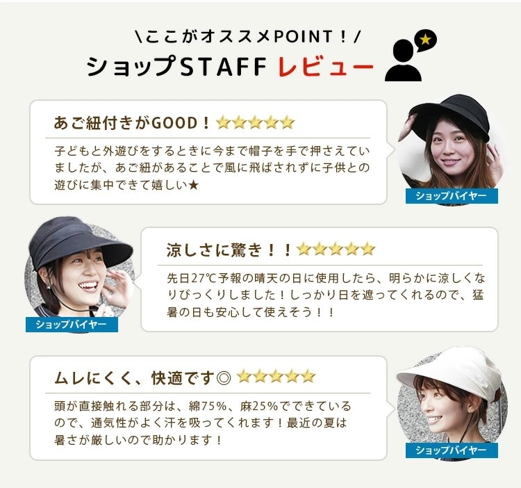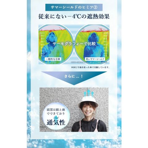Point.01 紫外線対策×暑さ対策 東レサマーシールドは東レ株式会社とオーロラ株式会社が協業した遮熱・遮光・紫外線遮蔽に優れた素材。 従来にない?4℃以上の高い遮熱効果や、最高レベルと言われる100%の遮光率、そして100%のUVカット率を実現し、肌にも優しく日差し対策を実現できます。 Point.02 つば広で小顔効果 つば11cmと紫外線や暑さから守りながらも小顔効果も期待できます。 Point.03 テープ調整でお好みのサイズに変更可能 帽子の後ろ面にあるテープで約3cmほど調整ができます。 Point.04 取り外しできるあご紐付き 外したいときは、内側のループから紐を外すだけ。 長さ調節もできるので、両手が塞がっていても、日傘代わりに使えます。 Point.05 ジョッキーとサンバイザーの2WAY ファスナーを外すことでジョッキーハットから、サンバイザーへ早変わり!活躍の幅が広がります! |
