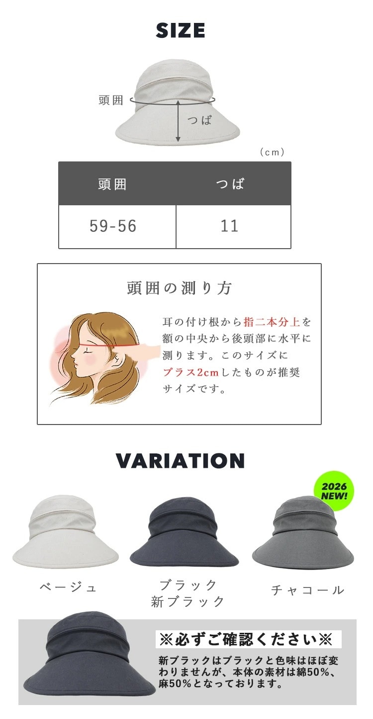 【本体(新ブラック以外)】綿 75%、麻 25% 【本体(新ブラック)】綿 50%、麻 50% 【つば裏部分】ポリエステル 100% |
