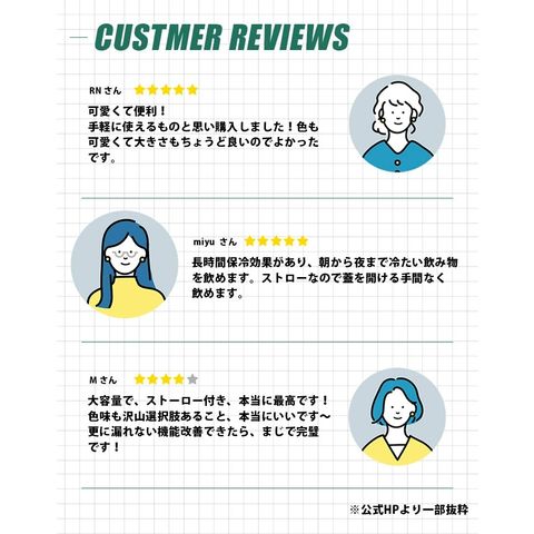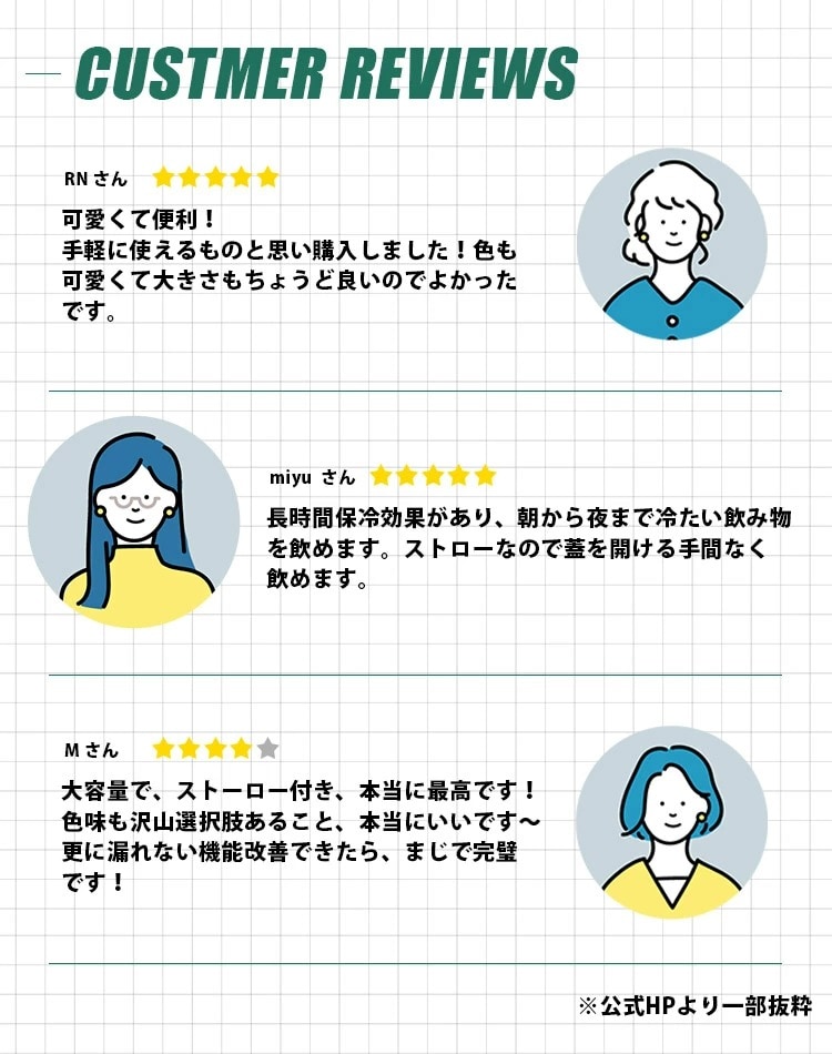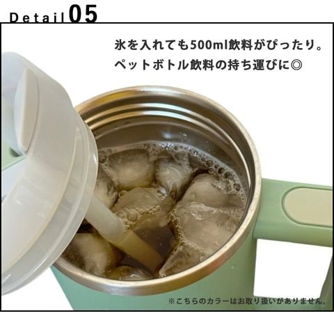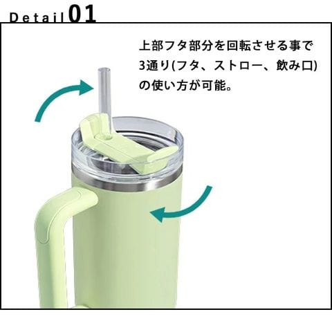 ■Detail1 上部フタ部分は、回転させることで3通りの使い方が可能に。 ■Detail2 ストローベースにシリコンカバーが付き、ストローは滑りにくく、中身もこぼれにくく改良されました。 ■Detail3 人間工学に基づいたハンドルはグリップにより、更に持ちやすくなりました。 ■Detail4 抜群の保冷力 ■Detail5 ペットボトル飲料の持ち運びに◎ |