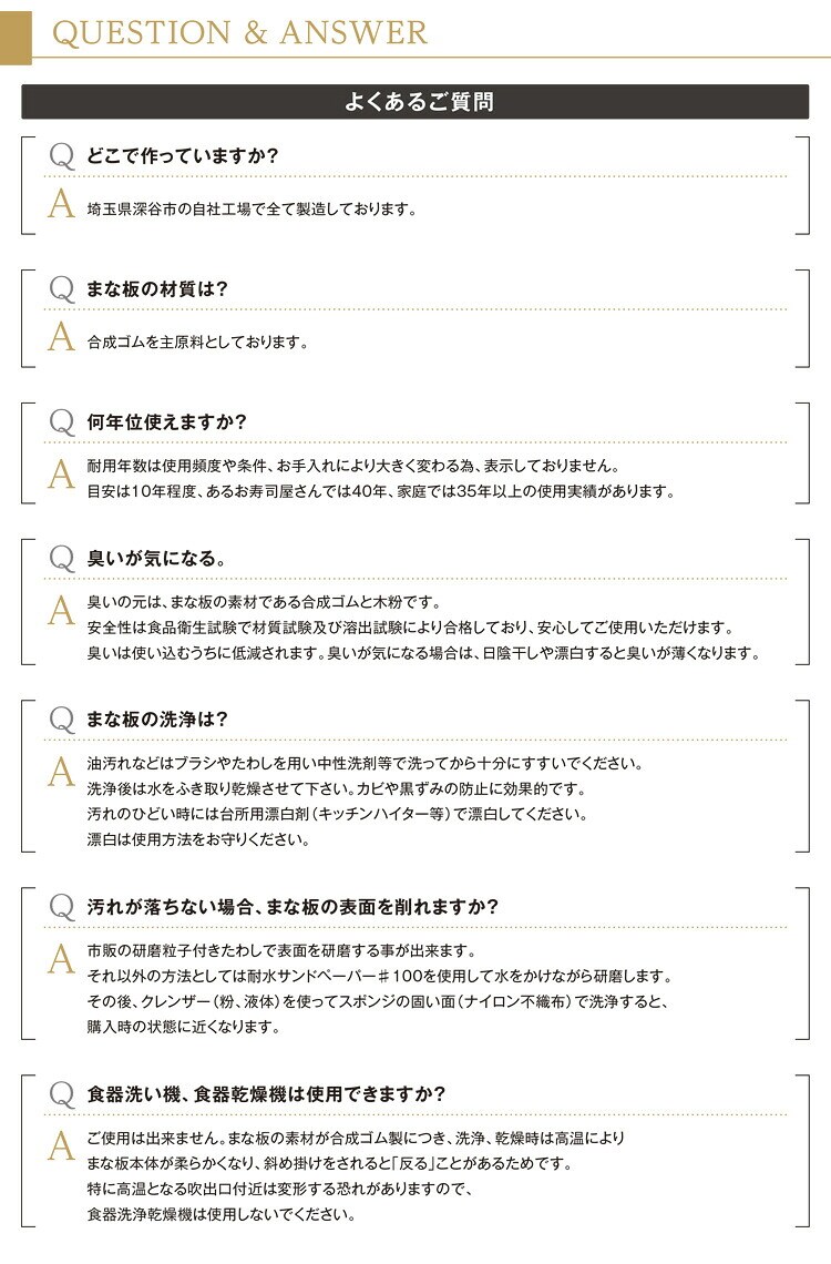 まな板に求められる重要な機能である衛生性と刃当り性を兼ね備え、長年多くのプロに愛用されています。 合成ゴムまな板はキズが入りにくく、キズが入ったとしてもゴムの力でキズを防ごうとする力が働くため、食材のカスが詰まりにくく雑菌の繁殖がしにくい素材です。 素材として用いられている合成ゴムは吸水性がないため、布巾でサッと拭くだけで水を切ることができます。 刃当たりが良いため、長時間の調理でも疲れにくく、包丁の刃を傷めにくいことも特徴です。 |