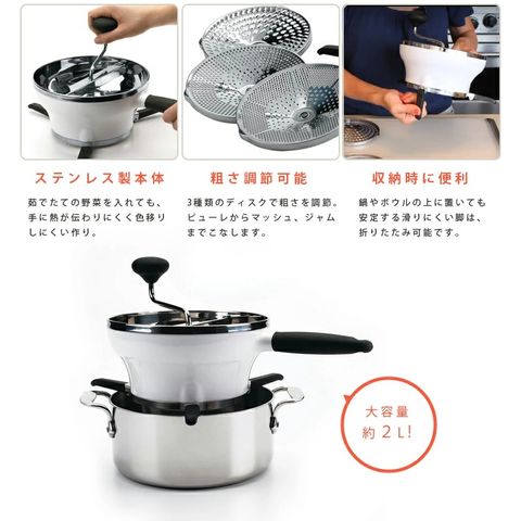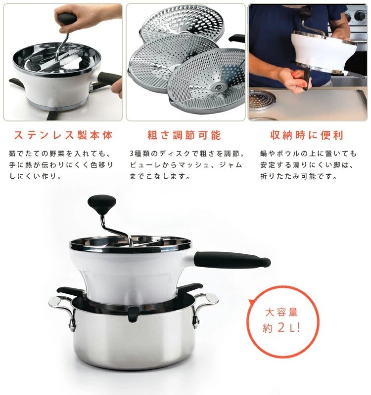 3種類のディスクで仕上がりを選べるフードミル。 ステンレス製の本体は熱いものでも使えるうえ、色移りもなく便利です。 クリーミーなソースや離乳食には細かいディスク、アップルソースや野菜スープは中間のディスク、マッシュポテトや歯ごたえを残したいお料理には粗目のディスクが最適。 ハンドルは簡単に取り外しでき、ディスクの交換も楽々。収納時に折りたたみできる脚付きで、ボウルやお鍋の上でも使えます。 |