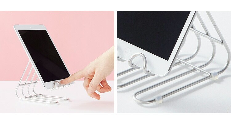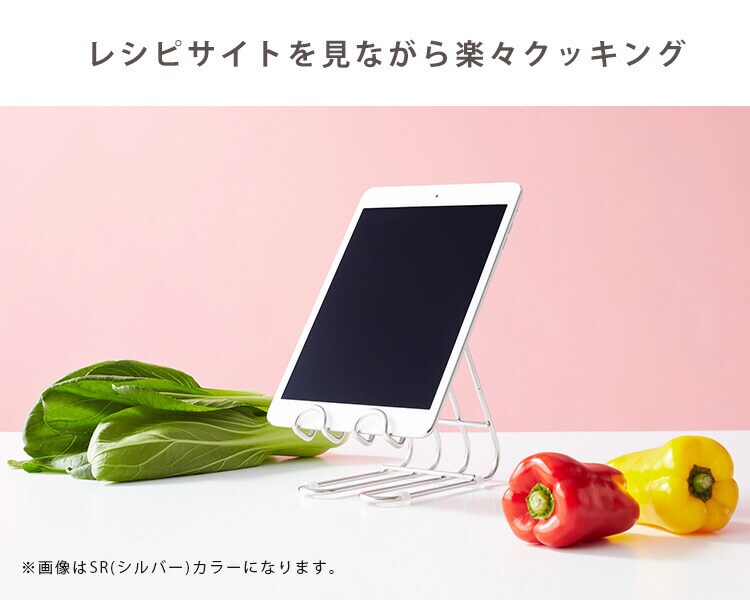 | お料理がスムーズに!レシピサイトを見ながら楽々クッキング。 スマホやタブレットでレシピや分量を確認しやすいスタンド。置き方を変えればまな板スタンドにもなります。 |