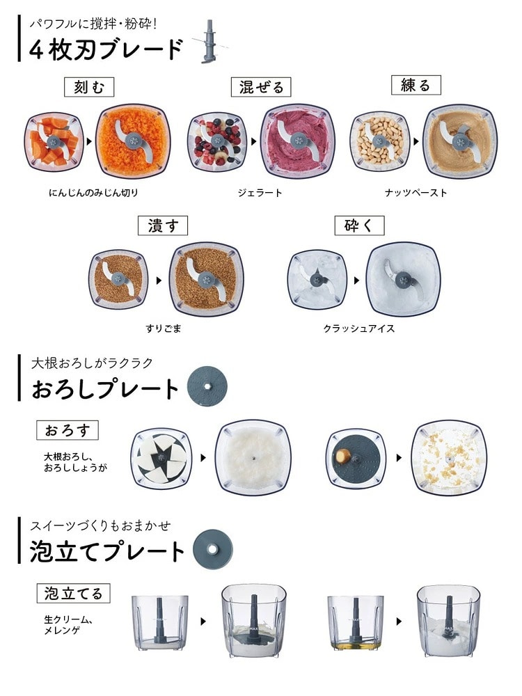 | 「おろし」「泡立て」の機能を追加!1台7役フードプロセッサー |