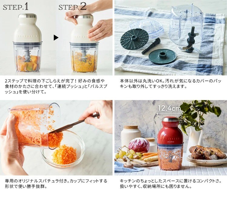 使い方は、「食材をひとくち大に切り」→「カップに入れてプッシュする」だけ! 2ステップで料理の下ごしらえが完了するシンプルな設計で、誰でも使いやすくお手入れも簡単です。 好みの食感や食材のかたさに合わせて、「連続プッシュ」と「パルスプッシュ」を使い分けて。 本体以外は丸洗いOK。専用のオリジナルスパチュラ付き。 キッチンのちょっとしたスペースに置けるコンパクトさ。扱いやすく、収納場所にも困りません。 |