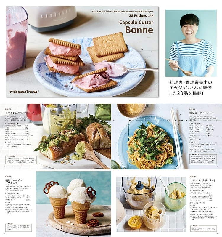 料理家・管理栄養士のエダジュンさんが監修した28品を掲載した専用レシピブックが付属。 簡単に作れる時短レシピばかり。料理のアレンジやポイントも紹介しています。 |