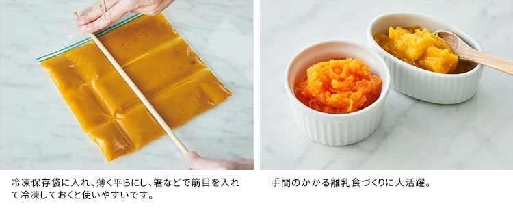 ボンヌを使えば、手間のかかる野菜のうらごしも簡単。手間のかかる離乳食づくりに大活躍。 すき間時間にまとめて作って、冷凍しておくと、ポタージュや赤ちゃんのごはん作りに便利です。 冷凍保存袋に入れ、薄く平らにし、箸などで筋目を入れて冷凍しておくと使いやすいです。 |