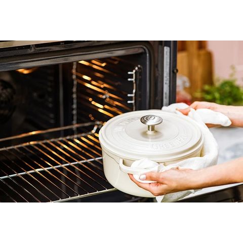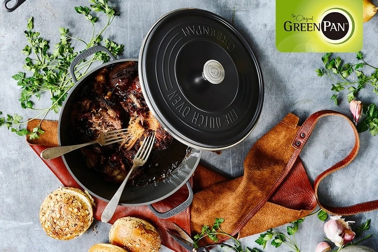 有害物質を一切使用していない調理器具を使ったヘルシークッキングを推奨しているグリーンパンの画期的なモデル「フェザーウェイト・ココット」は、最新の技術とスタイリッシュなデザインのシリーズです。 従来の鉄製鋳物鍋の約半分の重さでありながら、耐久性の非常に高いダイヤモンド配合のサーモロン・インフィニティプロ・ノンスティック・コーティングによるこびりつき難さはもちろんのこと、優れた熱伝導性、高い保温性も兼ね備えています。 これまで重さやこびりつきでお悩みの方には時に本製品の便利さを実感していただけます。 すべての熱源に対応しています。 |