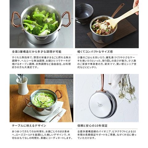 ● 全面3層構造だから多才な調理が可能 すぐれた熱効率で、野菜の栄養がまるごと摂れる無水調理や、ヘルシーな無油調理、お鍋ひとつでケーキが焼けるオーブン調理、余熱調理など自由自在。お料理好きの方も大満足です。 ● 軽くてコンパクトなサイズ感 少量のごはんを炊いたり、離乳食づくりや小さなケーキを焼いたりといった、取り回しの良さが魅力。少人数のご家族や単身者の方、新米ママ、買い替えシニア世代などにピッタリ。 ● テーブルに映えるデザイン あつあつできたてのお料理を、お鍋ごとそのまま食卓へ。ローズゴールドを基調とした美しいデザインで、大切なおもてなしの時間を、素敵にコーディネートします。 ● 信頼と安心の10年保証 全面多層構造鍋のパイオニア、ビタクラフトによる10年間の長期保証サポートをご用意。ながく大切に使っていただけます。 |