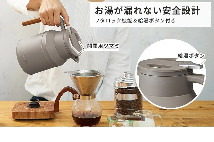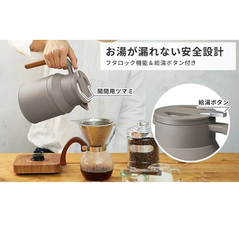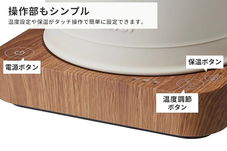● 温度設定や保温ができる シンプルなタッチ操作。沸騰モードに加え、3段階の温度設定・保温ができるので、お好みの飲み物に合わせて適温でお湯を沸かすことができます。 保温時間はたっぷり1時間。保温設定をした後は、本体を持ち上げても電源ベースに戻すと保温を再開してくれます。 ![]() ● お湯が漏れない安心設計 フタのツマミを2つ同時に押し込むことで開くようロックが付いていて、注ぎ口には給湯ボタン付き。 傾けただけではお湯が出ないから安心・安全です。口径が広めなので洗いやすいのもポイント。 ![]() ● 360度どこからでもセットOK 電源ベースにケトルを置くときは360度どこからセットしてもOK。コードレスなので使用時にストレスもありません。 ![]() |