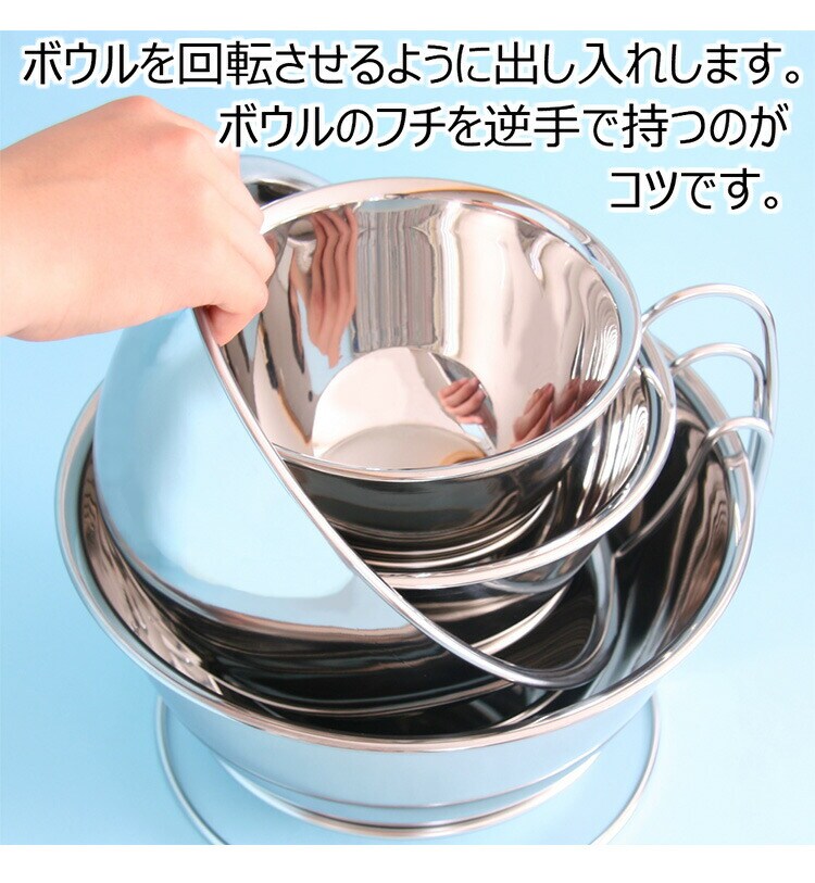 ・本製品は一般的な金属製ボウルを収納するラックです。それ以外の用途には使用しないで下さい。 ・強い衝撃を与えないで下さい。破損や変形の原因になります。 ・破損や変形した状態で使用しないで下さい。ケガをする恐れがあります。 ・火のそばに置かないで下さい。 ・不安定な場所に設置しないで下さい。 ・ボウルの形状によっては、ボウルラックに接触することがあります。 ・ボウルの形状によっては、収納できない場合があります。 その際は新たに収納できるボウルを店頭にてお買い求めいただくか、弊社純正ボウルをお買い求め下さい。 ・収納できないボウルを無理に収納すると、歪んだり破損したりする恐れがあります。 ・ガラス製のボウル等、重量のあるボウルを収納すると、歪んだり破損したりする恐れがあります。 ・本製品を引きずって移動させないで下さい。 ・乳幼児の手の届かないところに保管して下さい。 |