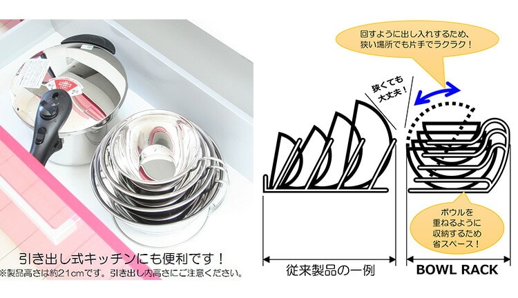 | 片手で出し入れできる!省スペースでたくさん収納できる ボウルを置くスペースがあればOK。狭い場所でも片手で簡単に取り出せる |