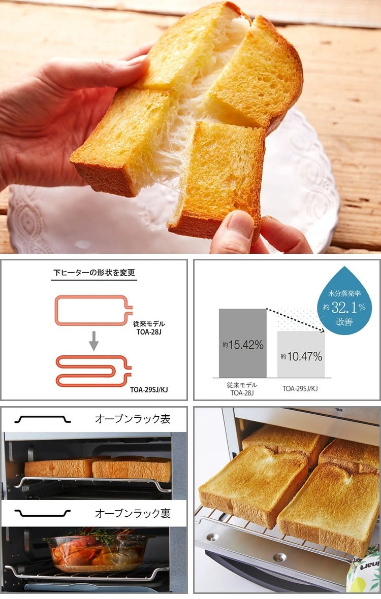 従来モデルと比べ、焼き時間が短縮されたことで、トースト内部の水分蒸発率が改善。