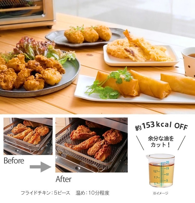 油を落としてもお肉などはパサつかず衣はサクサクで中はジューシーな食感をキープし、カロリーカットと美味しさを両立させます。
