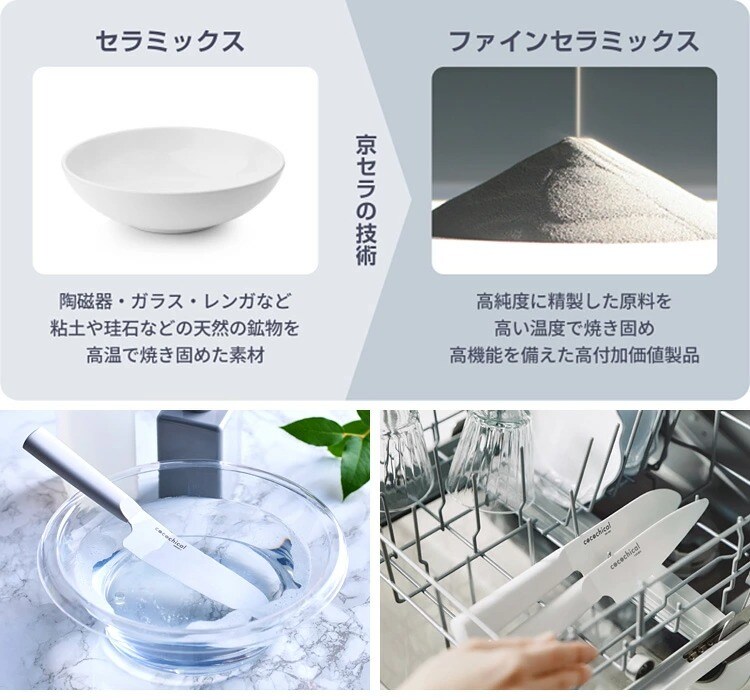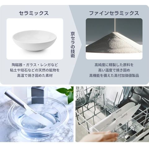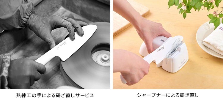 | ※ファインセラミックスは、ダイヤモンドでなければ研げないほど固いので通常の研ぎ石では研げません。メーカーにて研ぎ直しサービスをご利用いただくか、ご家庭でのお手入れにはダイヤモンドシャープナーをご使用ください。 ※硬い食材には使用しないでください。欠けたり、折れたり、割れたりすることがあります。(硬い食材例:カボチャ、冷凍食品(半解凍食品)、カニ、骨付き肉/魚など) | |