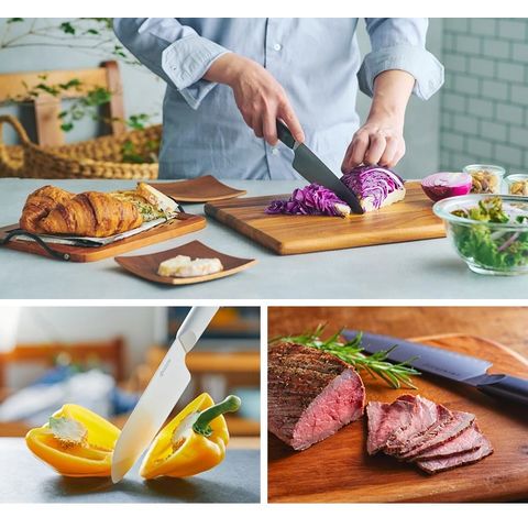 | 切れ味が長持ちする新セラミック素材を採用したセラミックナイフ 特許取得の新素材採用!刃が食材に吸い込まれていくような鋭い切れ味と、シンプルで美しく機能的なデザイン |