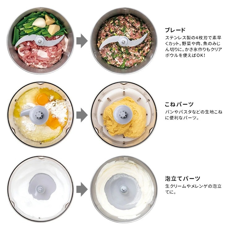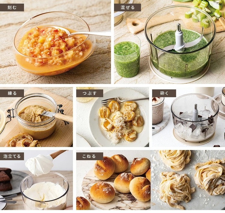 | 刻む・混ぜる・練る・つぶす・砕く・泡立てる・こねるの1台7役! みじん切りやペーストなどはもちろん、生クリームの泡立てやパン生地などのこね作業までこれ1台で |