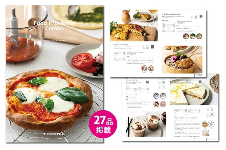 全42ページ・27レシピを紹介したボリュームたっぷりの専用レシピブックも付属。 材料の撹拌前、撹拌後の写真を掲載し、お料理教室のようにわかりやすくレシピを紹介しています。 |
