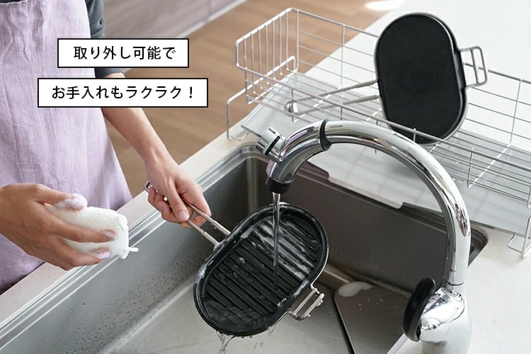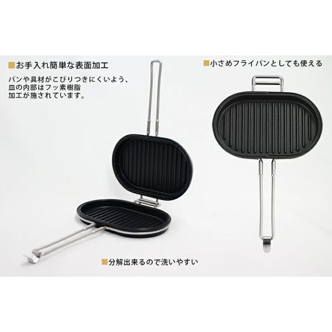 本体はフッ素樹脂加工が施されているので、パンや具材がこびりつきにくいです。 分解すれば小さめのフライパンとして使うことが可能で、洗う際もお手入れがしやすくラクラク。 |