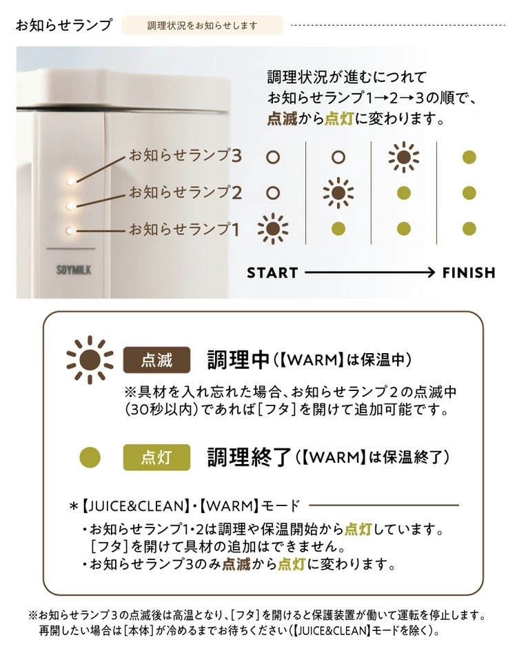 ● 選べる5つの調理モード 「SOYMILK」「POTAGE&PASTE」「SOUP&OKAYU」「JUICE&CLEAN」「WARM」 ● 誤作動防止の安心設計 蓋のスイッチマークがずれている状態では、ボタンを押しても調理は開始されません。 ● お知らせランプ ランプの表示で調理状況をお知らせします。 ◎ おしらせランプ1(下段)点滅 : 調理開始 ◎ おしらせランプ2(中段)点滅 : フタを開けて30秒間材料の追加OK ◎ おしらせランプ3(上段)点灯 : 加熱しながら攪拌。 調理完了後「ピッ、ピッ、ピッ!」とブザーでお知らせ、ランプが消えます。 |