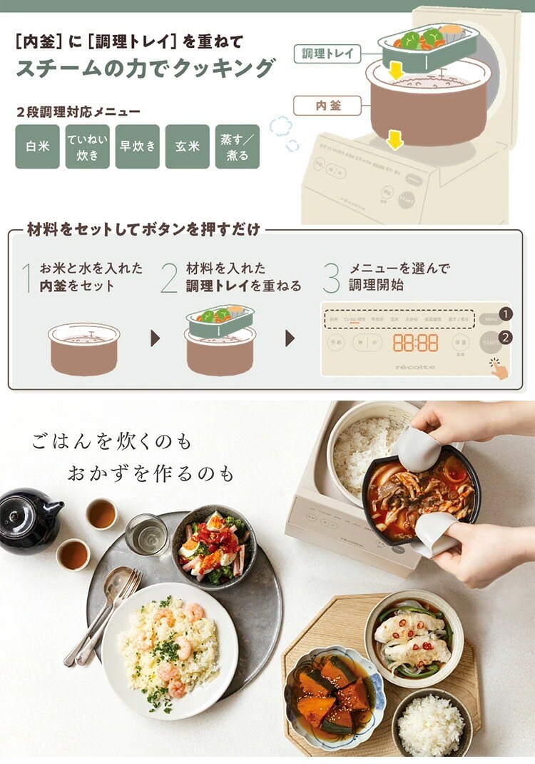 recolte クッキングライスクッカー 3合炊き 【クリームホワイト】(炊飯器 多機能炊飯器 同時2段調理 低温調理 蒸し料理 煮込み料理 レコルト レコルテ)【送料無料】