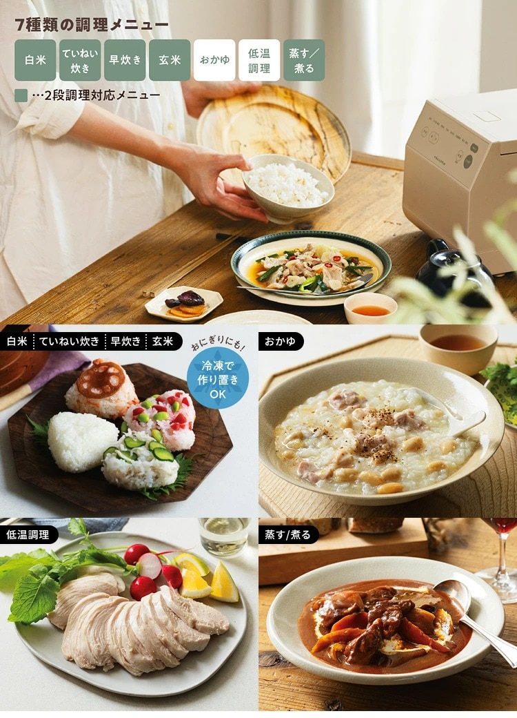 ごはんをおいしく炊く炊飯メニューはもちろん、【低温調理】や【蒸す/煮る】などの本格メニューも! 火加減を気にせず、ほったらかしで手軽に調理できます。 ● 【ていねい炊き】は釜内を約25℃に調節しながら約30分間浸水して炊飯します。 しっかり浸水することでごはんはふっくら(0.5?3合に対応。基本調理時間:約55?70分) ● 【おかゆ】は難しい火加減も不要で手間なくおかゆも炊けます。 (0.25?0.5合に対応。調理時間は1?2時間の間で設定可能) ● 【低温調理】は釜内を約65℃にして調理する低温調理です。 サラダチキンや甘酒も手作りできます(調理時間は10分?12時間で設定可能)。 ● 【蒸す/煮る】メニューは、釜内を約100℃にして調理。 ビーフシチューやチャーシューもホロホロに(調理時間は10分?3時間で設定可能)。 |