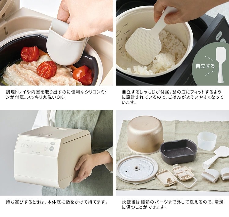 毎日使ってほしいから、「使いやすさ」にこだわった設計に。 シリコンミトンしゃもじなど、便利な付属品もオリジナルデザインです。 ・調理トレイや内釜を取り出すのに便利なシリコンミトンが付属。スッキリ丸洗いOK。 ・自立するしゃもじが付属します。釜の底にフィットするように設計されているので、ごはんがよそいやすくなっています。 ・持ち運びするときは、本体底に指をかけて持てます。 ・炊飯後は細部のパーツまで外して洗えるので、清潔に保つことができます。 |