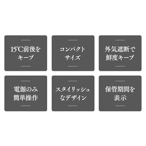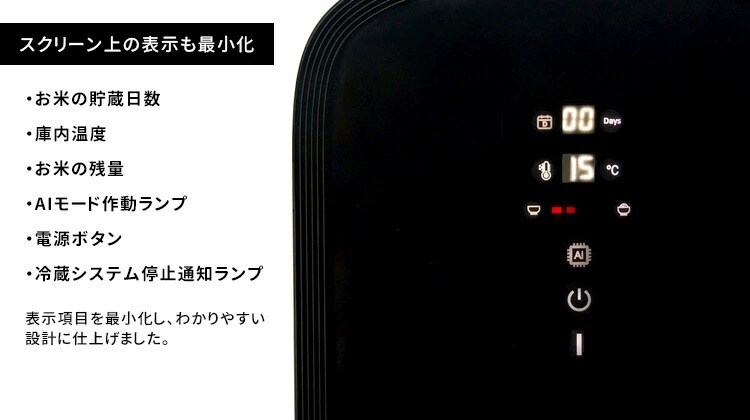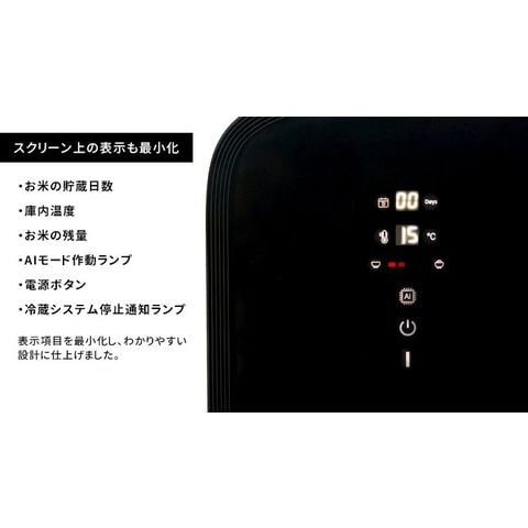 | お米を新鮮保存!適温15度キープ&保存日数表示!米用冷蔵庫 お米が劣化しにくい温度「15℃前後」を自動でキープ。常に新鮮でフレッシュなお米が食べられます。 |