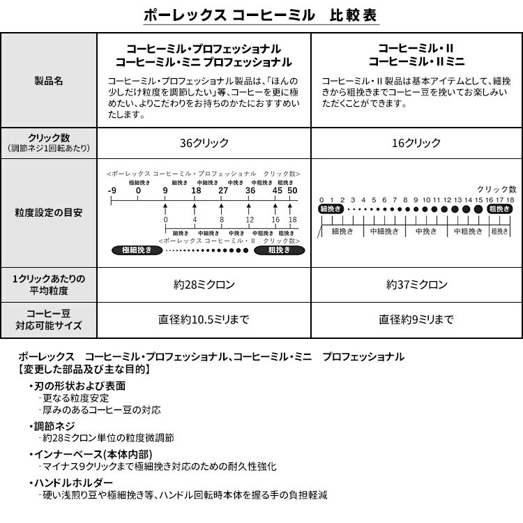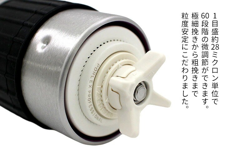 ● 1目盛約28ミクロン単位で60段階の微調節ができます ※ポーレックス コーヒーミル・IIは1目盛平均37ミクロン単位で18段階の調節が可能 ● 調節ネジ1回転あたり36クリックです ※ポーレックス コーヒーミル・IIは調節ネジ1回転あたり16クリック ● エスプレッソ等細挽きの粒度調節をしたいとき特に役立ちます 数ある手挽きコーヒーミル製品のうち最も細かく挽けます。 ※中煎り豆を使用、コーヒー豆の焙煎具合により異なります。生豆に近い状態の水分が多く残っている浅煎り豆の場合、湿った粘り気により細かく挽くことができない場合があります。 ● 本体の内部構造を更に強化・改造 セラミック刃同士を強く締めつけることができるので、-9クリックまで極細挽きの粒度調節が可能です ポーレックス独自の開発・技術による刃形状にセラミックの強みを最大限活用して実現しました。 |