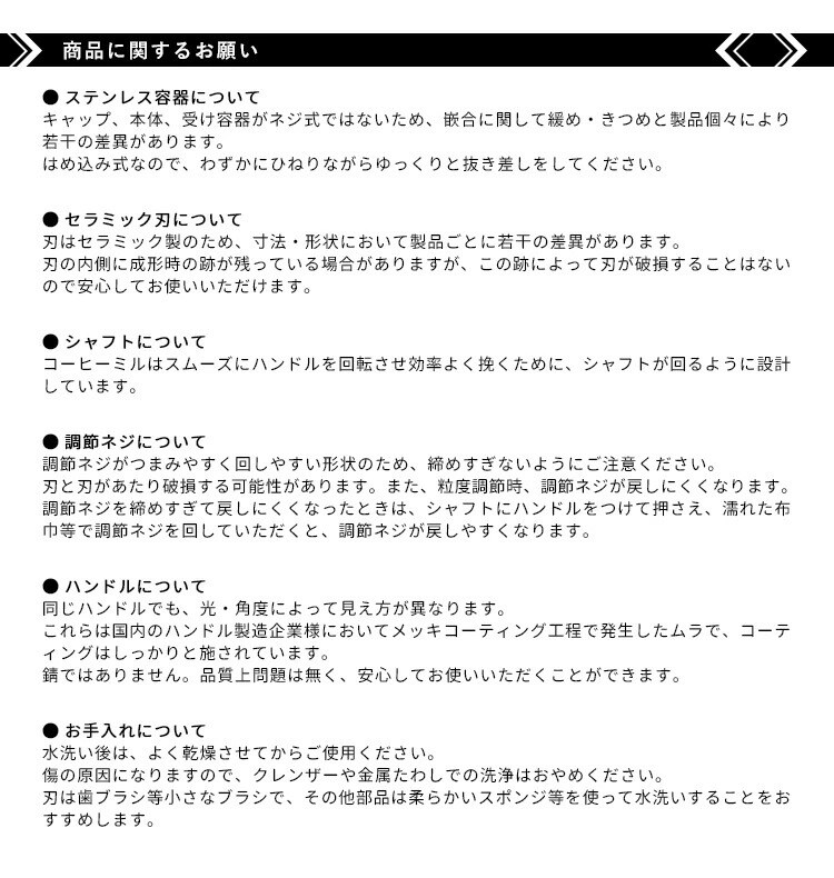 | コーヒーを更に極めたい方のために。金属より硬度の高いセラミック刃のエッジで確実にコーヒー豆を刻みます。極細挽きから粗挽きまで粒度安定にこだわりました。 |