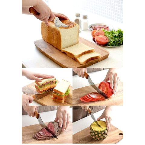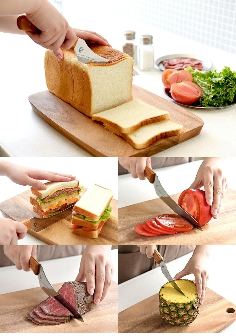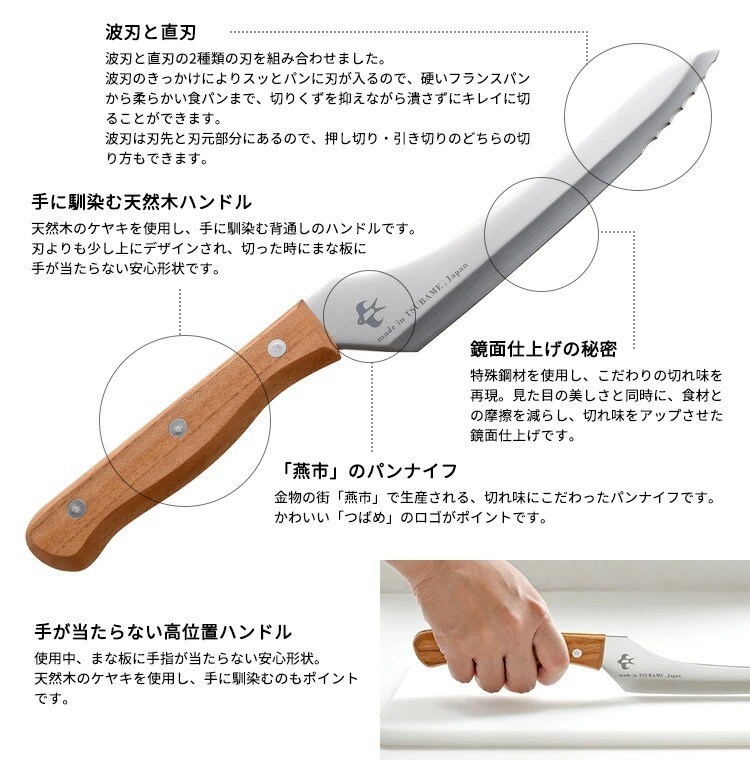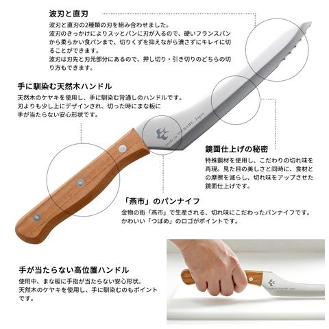 波刃と直刃の2種類の刃の組み合わせにより、パンの切りくずを抑えながらきれいに切り分けられる刃渡りの短いパンナイフ。 波刃のきっかけにより硬いフランスパンも、刃が入らずに潰れやすい柔らかい食パンも簡単に切れます 刃は特殊鋼材を使用し、見た目の美しさと同時に摩擦を減らし切れ味をアップさせた鏡面仕上げです 天然木のケヤキを使用した手になじむ背通しハンドルで、まな板に指が当らない親切設計です。 刃渡り16.5cmと短いので、パンをカットする以外に普段のお料理にも活躍してくれますし、収納性も大幅にアップしました。 アウトドアに持ち出して、ホットサンド用のナイフとしても便利です。 金物の街「燕市」で製造しています。 |