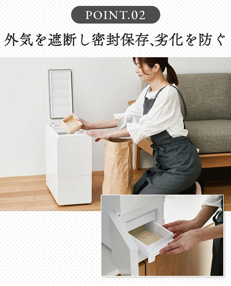| 【正規販売店】適温に自動調整!新たに急速モードを搭載&コンパクトに!精米したての美味しさを食卓へ。お米専用冷蔵庫で鮮度長持ち。適温15℃自動キープ&密封保存。 |