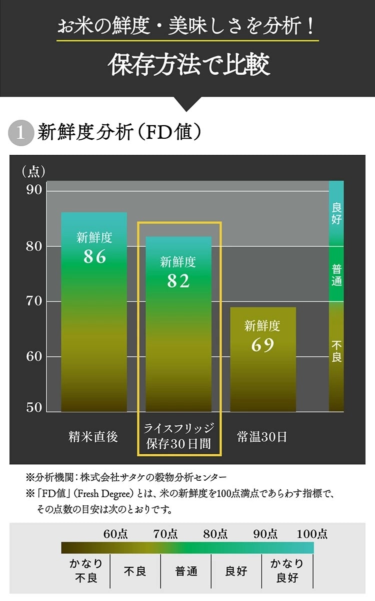 本体前面にタッチスクリーンを搭載。簡単な操作で2つの保存モードを選択できます。 操作性に優れ、誰でも簡単に使いこなせるデザイン。 「自動モード」は庫内の米残量と温度環境に合わせて自動で冷却を調整します。 「急冷モード」は庫内の米残量、温度環境に関わらず最大で冷却出力します。 「急冷モード」はお米を冷やす能力をパワーアップ。暑い季節など瞬時に適温に調節することが可能です。 ● 玄米の保管にも 「急冷モード」は玄米貯蔵の際にも大活躍します。 玄米は収穫後も呼吸を続けています。保管温度が高いと呼吸が活発になり、その過程でおいしさの源であるデンプンを消費するため風味の劣化を早めます。さらに、呼吸熱により熱を発生させるため、精米後のお米と比較してさらに低い温度での保管が推奨されます。 急冷モードは自動モードよりも冷却能力が高いため、玄米の保管にも最適です。 |